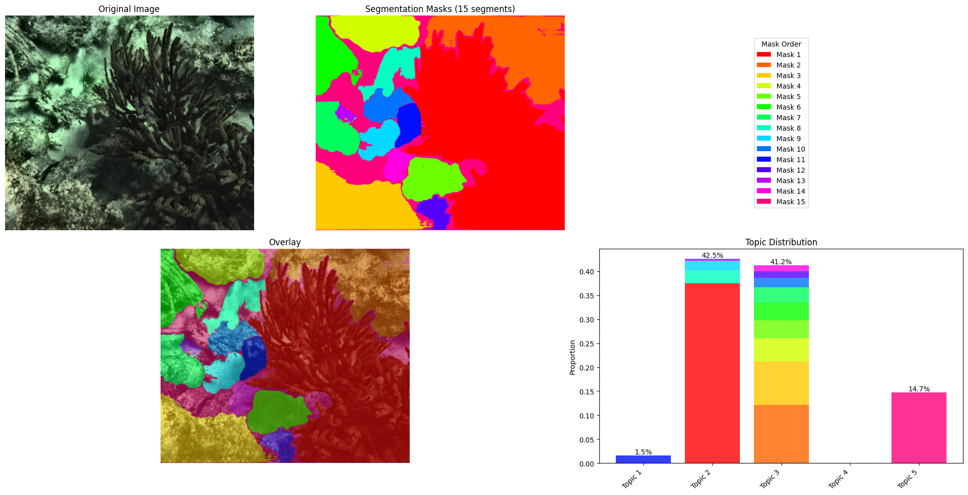 I specifically focused on automatic coral reef topic modeling to identify potentially sick or dying coral and assess overall reef system health in a more efficient, automated way. I implemented the Segment Anything Model (SAM) and K-Means clustering techniques to segment and analyze coral reef images. By clustering extracted features, we derive topics representing different coral landscapes—enabling us to quickly detect health anomalies and monitor reef conditions at scale.